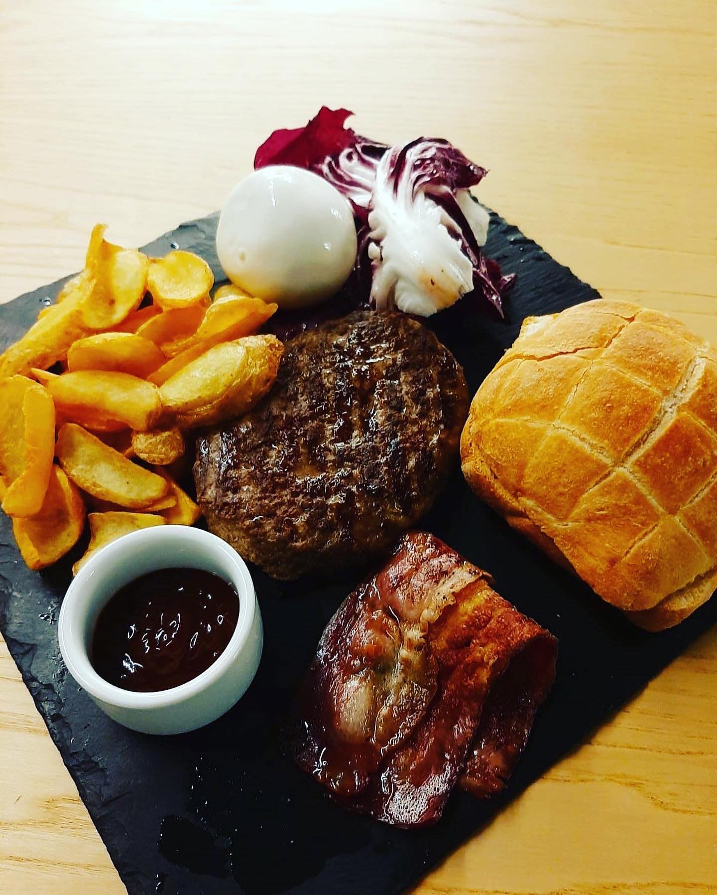 Black Burger (Hamburger di Scottona, Bacon croccante, Valeriana, Cheedar, contorno Chips)